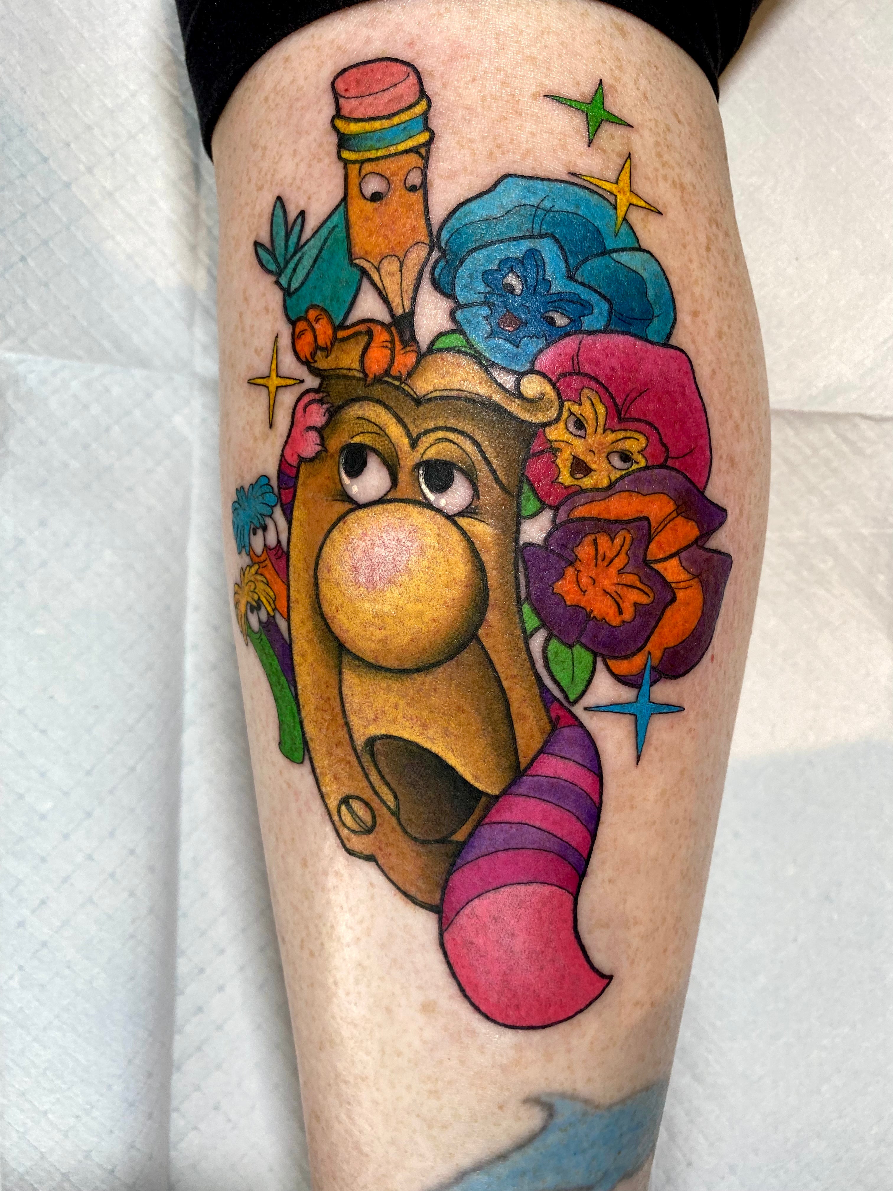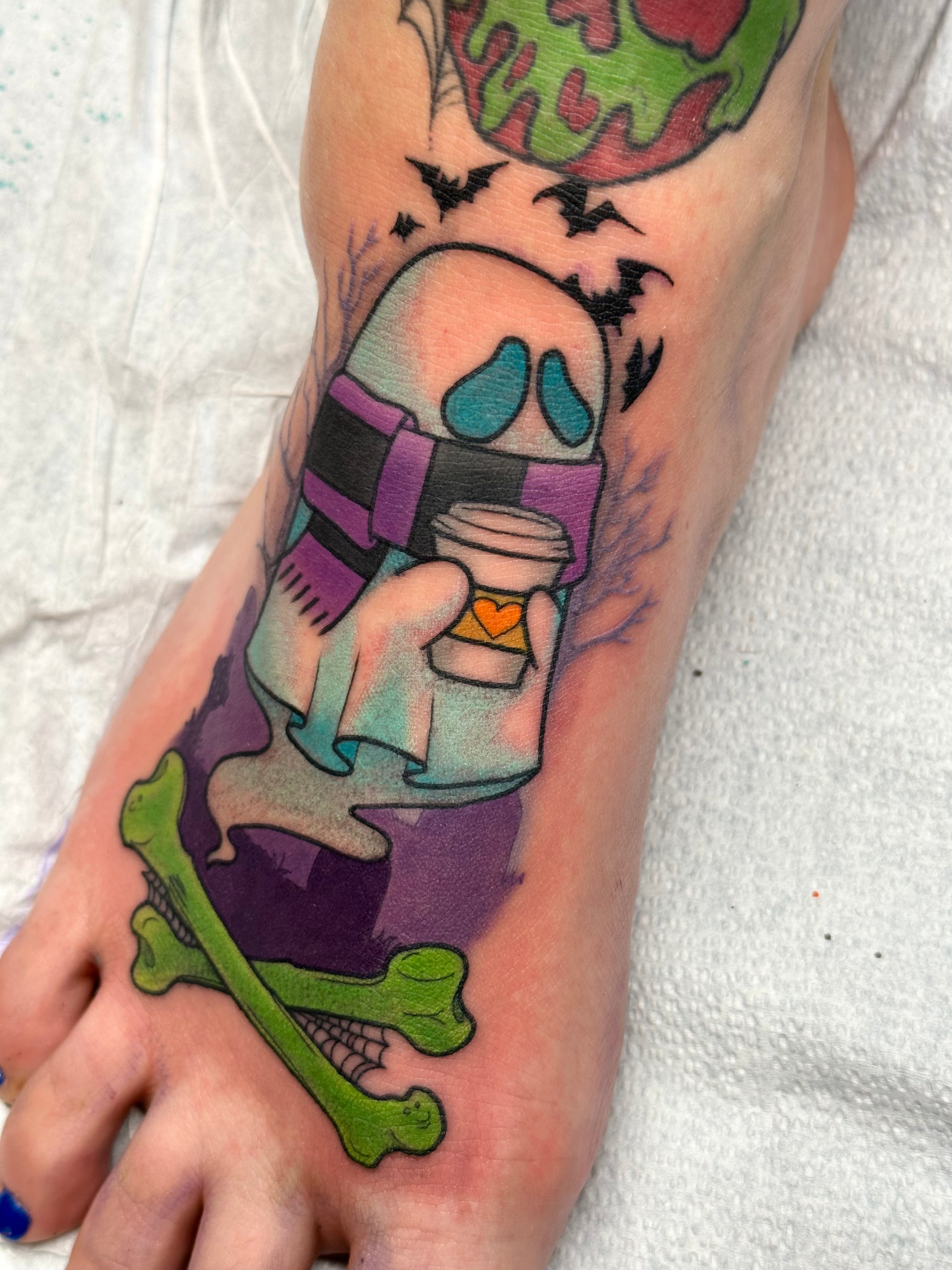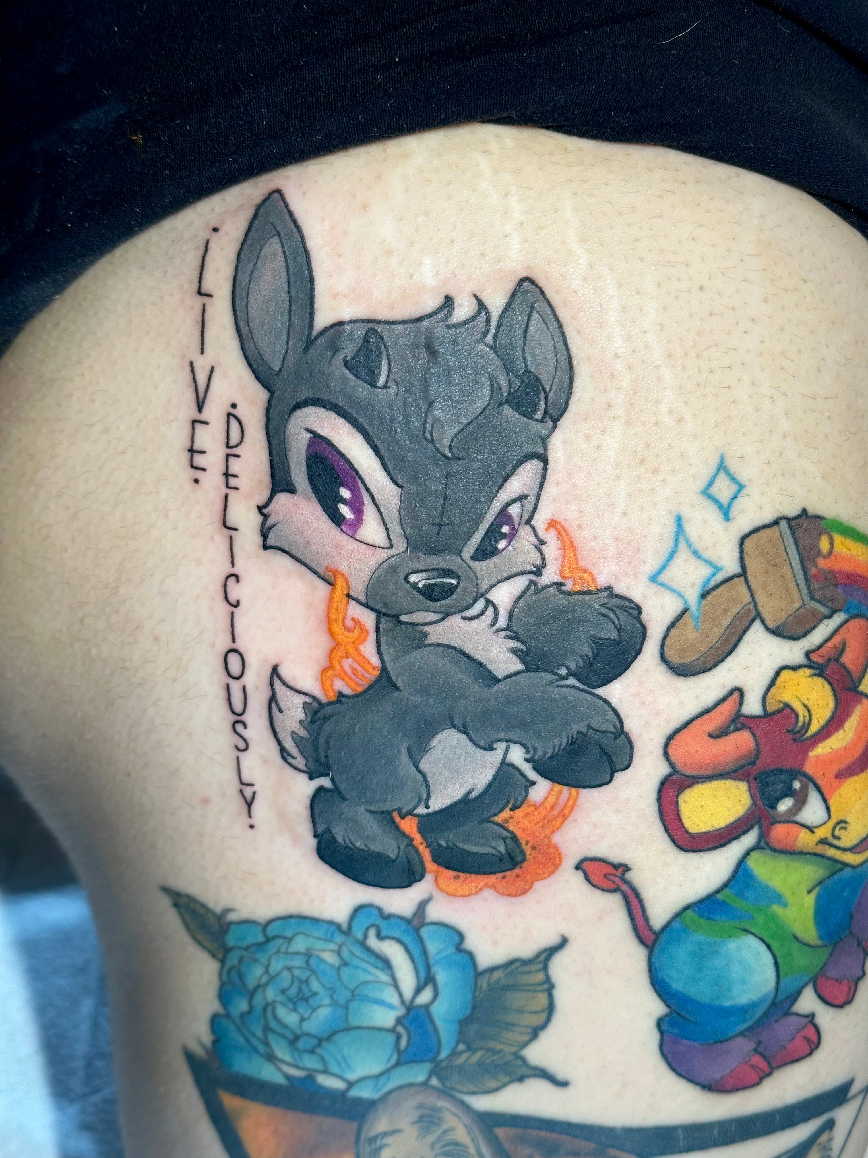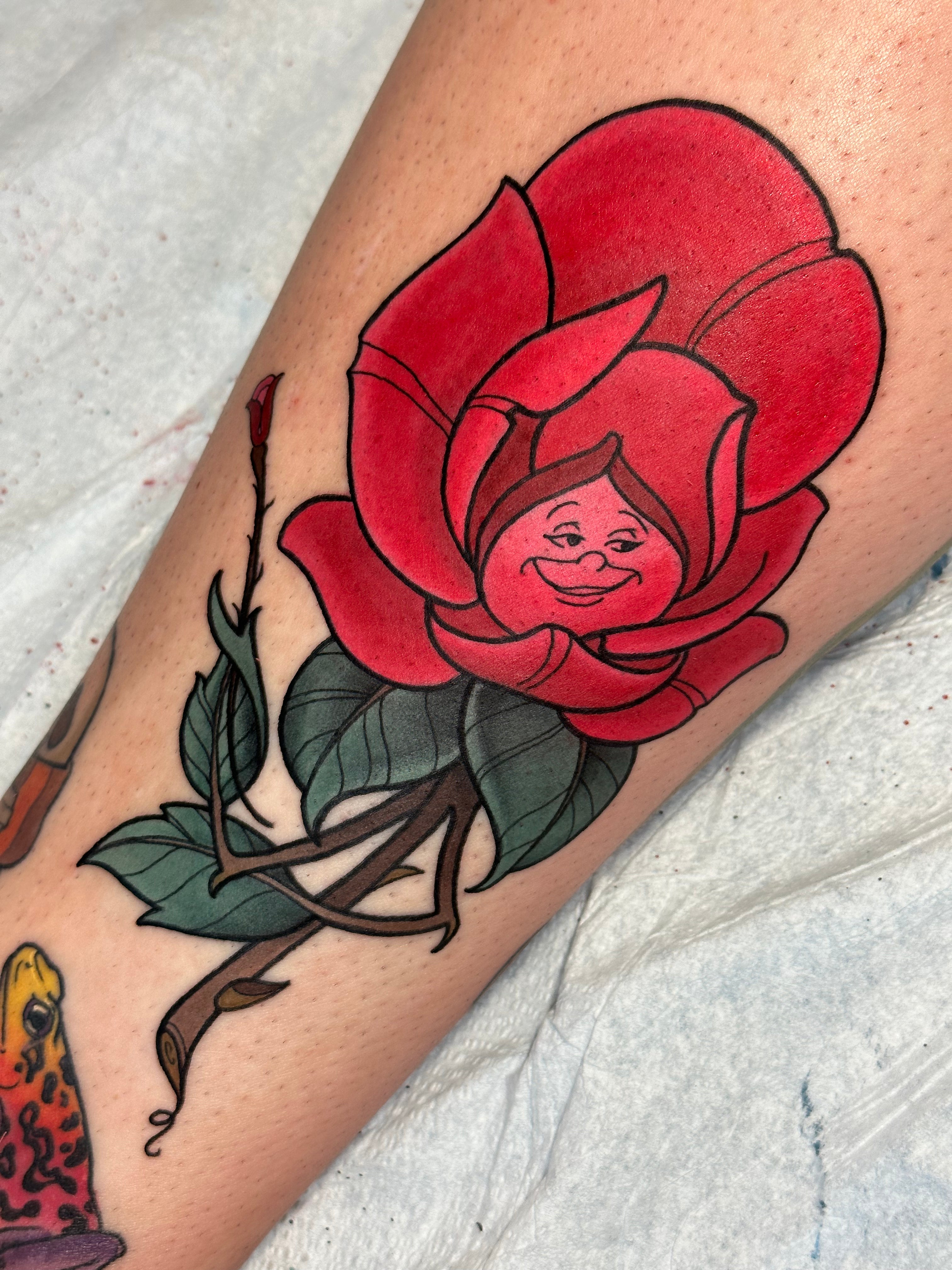 I focus mainly on cartoons and pop culture but I also enjoy tattooing flowers, animals//pets, plants, food, anything I can make fun and bold!