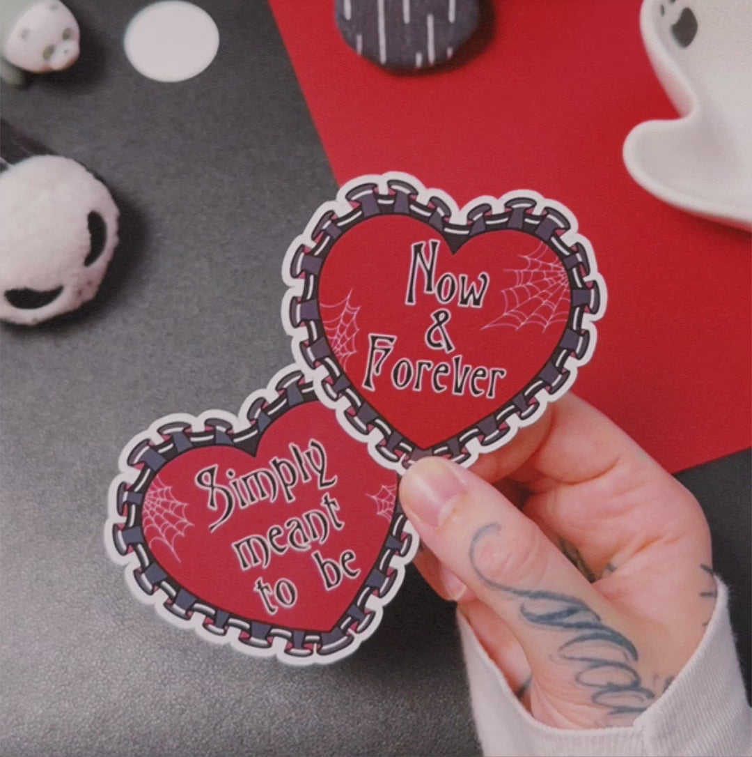 🖤- Live like Jack and Sally with these romantic ruffled heart stickers. The perfect gift for your emo sweetheart. Add some spooky cuteness to your laptop, notebook, emotional support water bottle or that pile of coveted stickers you’re too afraid to commit to sticking.